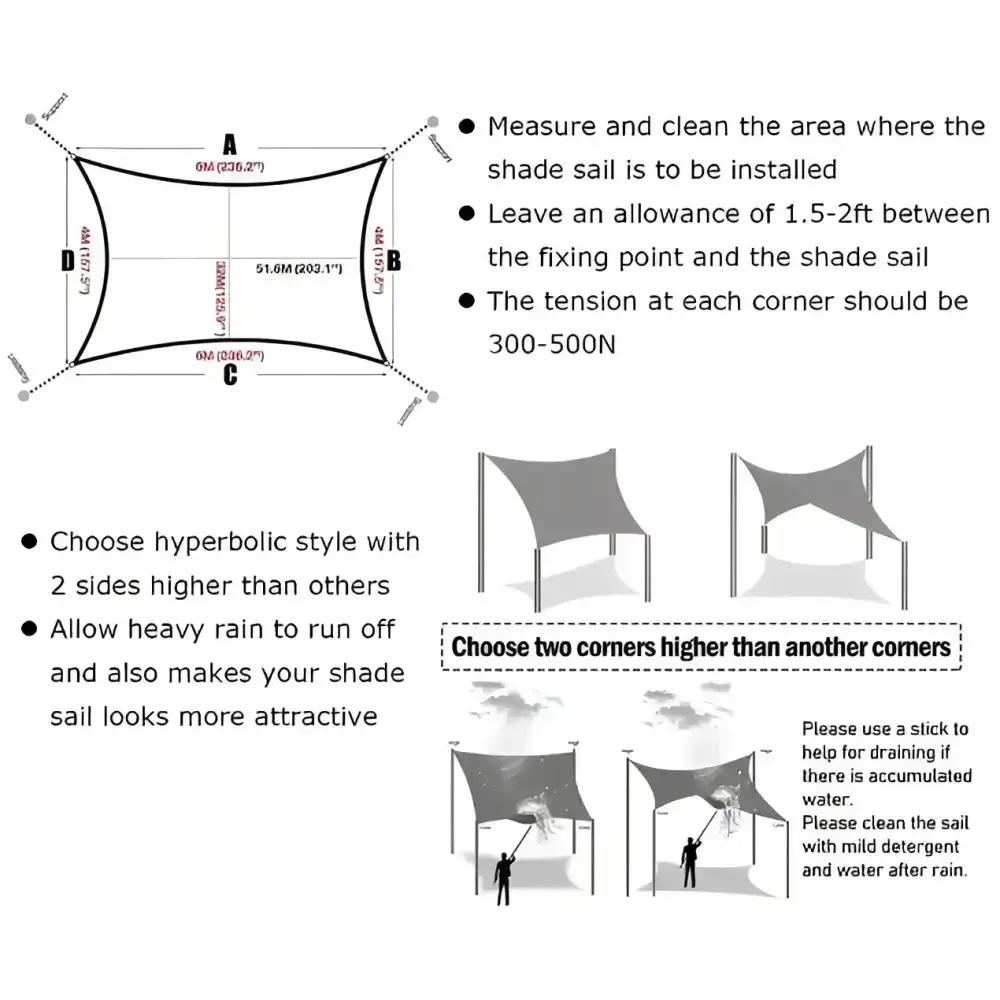 Toldo vela de la dimensión elegida, cuerdas de fijación y bolsa de almacenamiento transparente