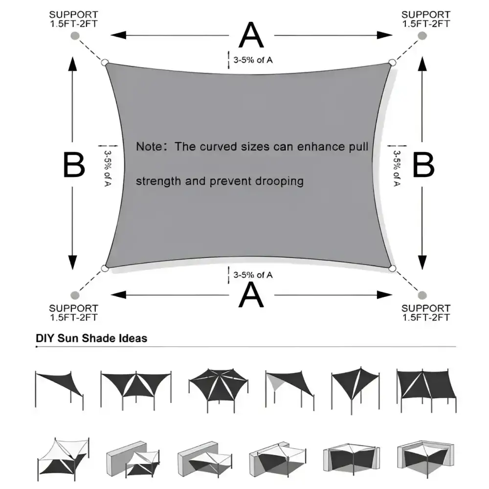 Toldo vela de la dimensión elegida, cuerdas de fijación y bolsa de almacenamiento transparente