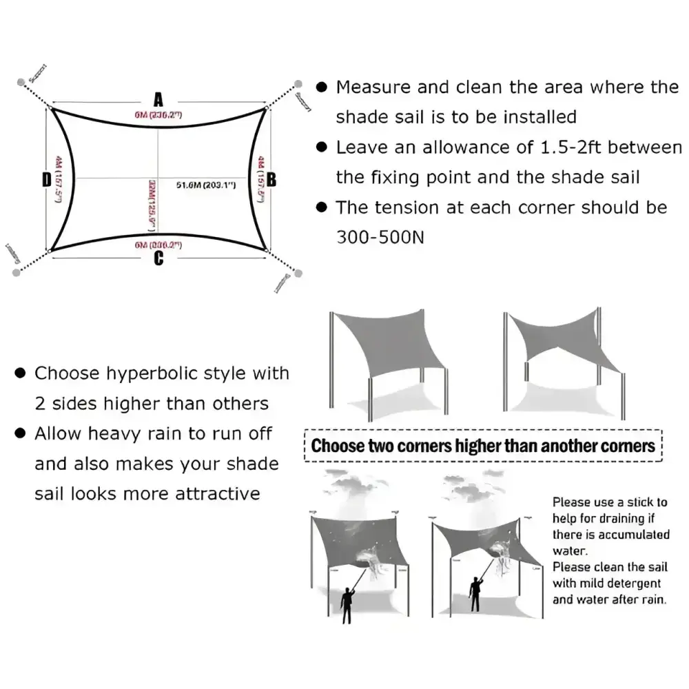 Este toldo vela triangular es impermeable y repelente al agua, ideal para proteger del sol y lluvias ligeras. Su instalación es sencilla gracias a los bucles de 40 cm en las esquinas y las cuerdas de fijación incluidas. Además, se pliega fácilmente y puede guardarse en su bolsa de almacenamiento transparente, ocupando poco espacio cuando no se utiliza.